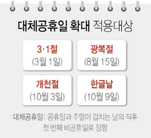설·추석 연휴, 3·1절(3월 1일), 어린이날(5월 5일), 광복절(8월 15일), 개천절(10월 3일), 한글날(10월 9일)에 대체공휴일 제도가 운영되고 있습니다.